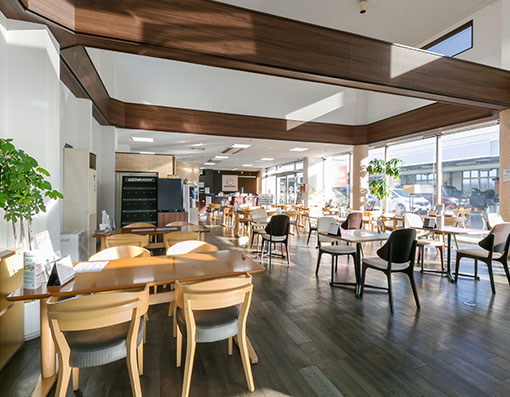 お客様駐車場15台、AED、キッズコーナー、インターネットコーナー