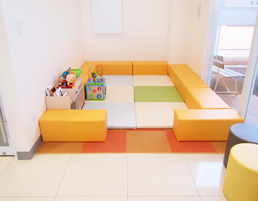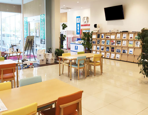 お客様駐車場12台(車いす専用駐車場あり)、キッズコーナー、バリアフリートイレ