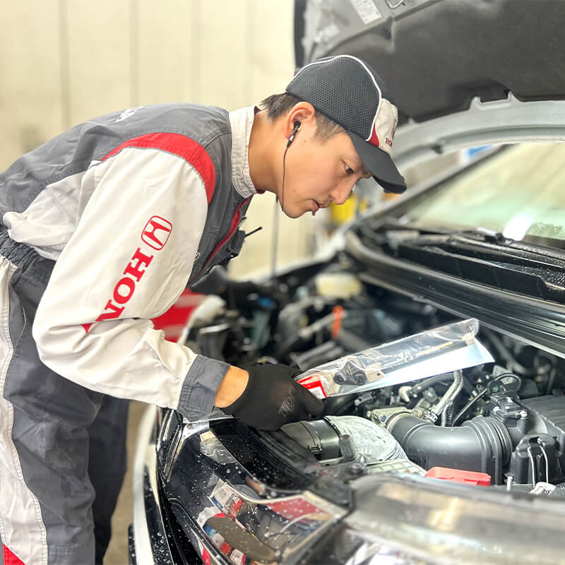 Honda車はメカニックとしての腕の見せ所がたくさんあり、大変な分だけやりがいも大きいです。入社1年目は主に点検などの業務を行いましたが、2年目くらいから少しずつ難易度の高い整備をするようになり、次第に一通りの仕事を任せていただけるようになりました。お車をお預かりし、整備を行い、その実施した整備内容をお客様にお伝えした時「ありがとう」と言っていただけると、とても嬉しいです。そしてその「ありがとう」を言っていただくためには、安心や安全をご提供するという責任があります。責任感を強く持って、自分の人間性や技術などを高めながら、成長を感じられる仕事だと思っています。