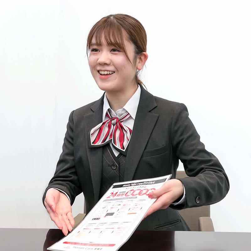 フロアサポートの仕事は、接客半分、経理事務が半分。お出迎えやお見送り、各種サービスの受付などの業務を通じて、お客様と接する機会が多くあります。一見仕事だけでお客様との繋がると思われがちですが、実はそうではありません。お客様と趣味の話で仲良くなったりすることだってあります。たまに営業には話さないようなこともフロアサポートにだけは話してくれるお客様もいらっしゃるので、大変勉強になったりもします。一般的な事務職ですとデスクワークがメインのイメージですが、Hondaのフロアサポートは少し違う楽しさがあります。経理事務の仕事も、トラブルやミスはお客様やお店とスタッフにご迷惑をおかけすることにもなるので責任感も重要。緊張感もありますが、みな「お客様の為に」という意識を共有しながら、助け合いながら常に前向き取り組んでいます。